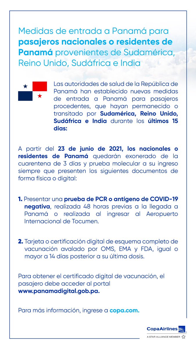 Copa Airlines On Twitter Importante Pasajeros Nacionales O Residentes De Panama Provenientes De Sudamerica Reino Unido Sudafrica E India Tendran Nuevas Medidas De Entrada A Panama A Partir Del 23 De Junio